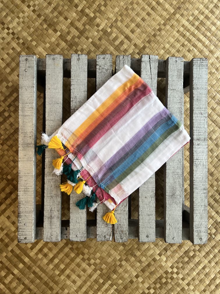 Breathable Rainbow Mulmul Cotton Saree with Pompoms!