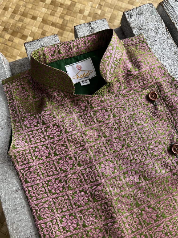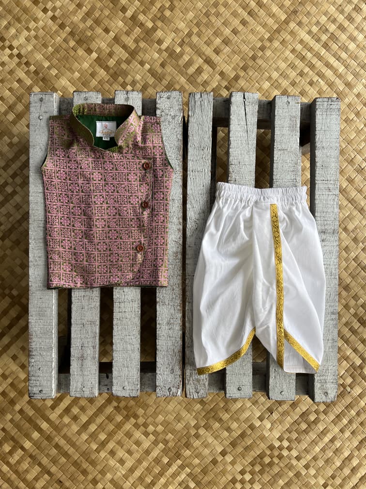 Regal by spirit, effortless by style — Aadai’s sleeveless brocade kurta and dhoti redefine modern majesty.