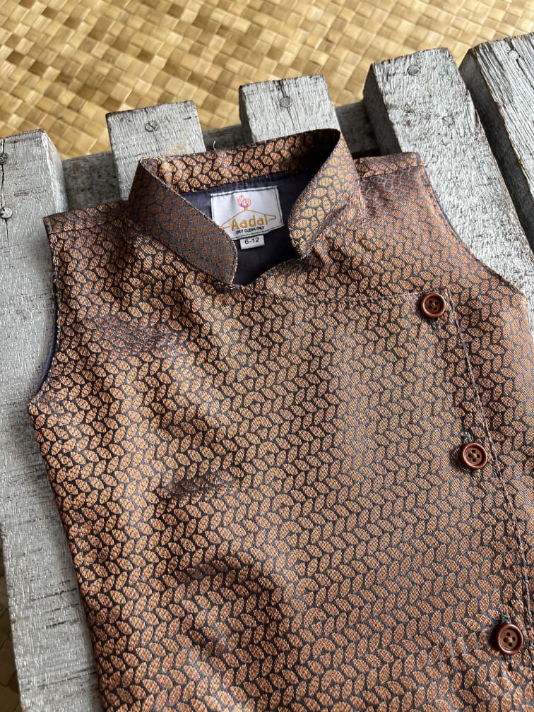 Regal by spirit, effortless by style — Aadai’s sleeveless brocade kurta and dhoti redefine modern majesty.
